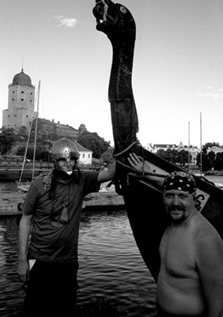 ![]() I samband med sjösättningen "myrar" vi skrovet. Myrningen är en gammal teknik med vilken man tätar ett läckande skrov: Genast efter sjösättningen för man en låda, innehållande material från en myrstack, ned i vattnet under båtbottnen. Sedan drar man av lådans lock varvid skräpet från myrstacken sugs in i skrovets springor och täpper till läckorna. Det fungerar. | ![]() Attila (höger) skänkte oss den egenhändigt tillverkade stridshjälmen, som här bärs av undertecknad (vänster). I bakgrunden syns Viborgs fästning. |