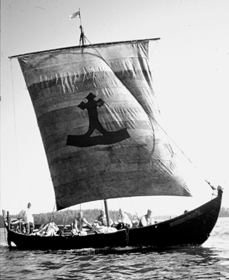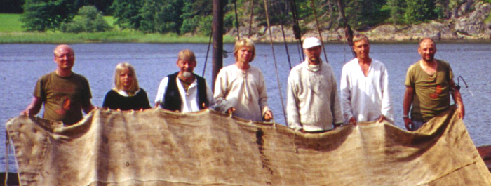| För det mesta blir det att ro men ibland kan vi hissa segel. - Före avfärden från Viborg sydde vi Rus-projektets logo på seglet. Vår logo är en fornfinsk "Ukkokirves", som är ett slags motsvarighet till den fornskandinaviska Torshammaren. Några mytologer ser i den det uppochnedvända livsträdet. Den finska författaren Timo Heikkilä har skrivit boken "Ukkokirves" där han behandlar mytologin kring symbolen. | ![]() |