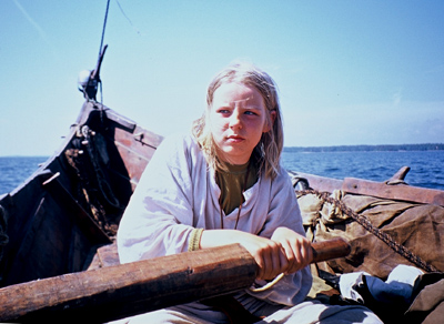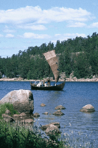 ![]() Vi glider in i sundet mellan Lapuri holmen och fastlandet. Här seglade den forntida sjöfararen i österled. | ![]() Ett historiskt ögonblick. Vi har tagit i land på Lapuri holmen. På havsbotten, ett stenkast ifrån oss, ligger det 1000 år gamla skeppsvrak som utgör förebild för Heimløsa Rus. |
