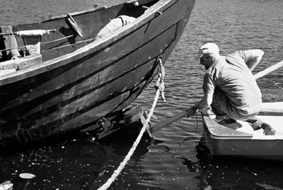 Vi tömmer skeppet och tar upp det på land. Under de följande dagarna tjärar vi Heimløsa rus både utifrån och inifrån. Den svarta tjäran, som vi själva har bränt under våren, ger henne en vacker ansiktslyftning.