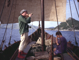 1.5.99 lauantaiOppi, että jos nukkuu soutupenkillä, niin airot kannattaa järjestellä viereen. Oli melko muhkurainen yö. Muessin (=minareetin huutaja) herättää taas 05.15, mutta kaikki jatkavat untaan. Olen niin hiton väsynyt, että päiväkirjan pito on ihan sekaisin. On varmaankin vappupäivä Suomessa. GSM kilisee humalaisia puheluita. Turkissa ei ole elettäkään Vapusta. Fredrikin mukaan se on poliittisista syistä pannassa.Puolelta päivin soudetaan ulos Bodrumista. On kuuma. Neljä äijää soutaa, yksi styyraa ja yksi huilaa. Kymmenen minuutin tuurit kiertää myötäpäivään. Ahterin styyrpuurin airo on tahtiairo. Fredrik opettaa meille heti alkuun suodun pikku niksejä. Käsissä alkaa olla ensimmäiset rakot. On myös tärkeää, että soutaa molemman puolen airoja. Lihakset rasittuu tasaisemmin. Saadaan myös purje hetkittäin vetämään. Vallitseva tuuli tähän aikaan vuodesta on MELTEM, joka tulee jostain kaukaa pohjoisesta ja oleva valtaosin meitä vastaa koko reissun ISTANBULIIN. 23.00 kieppeillä saavutaan GUMUSLUK nimiseen kylään. Uiva museo otetaan jälleen innolla vastaan. Fredrik juhlistaa ensimmäistä päivää merellä - Raki-pullo tilataan pöytään. Se huuhdellaan alas hyvällä paikallisella EFES oluella. | ![]() |