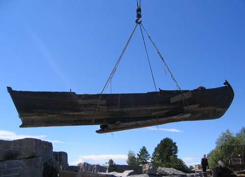 ![]() | I den här bilden, där shnjakan sjösätts med kran, ser man den långa raka kölen som ger båten en stadig gång i sjön. Stockarna som hänger under skrovet är där för att stötta skrovet under transporten. Foto: Henri Bergius. |