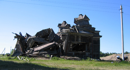 ![]() | Kyrkor i byn Paltoga på Onegas sydoststrand. Man kan se att det görs tappra försök att restaurera kyrkorna, men i brist på medel blir arbetet ofta avbrutet på obestämd tid. |