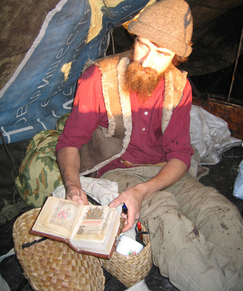 ![]() | Den gammaltroende Feodosi. Han förevisar stolt sina religiösa skrifter som han läser ur varje kväll. Han har själv handskrivit böckerna, som är kopior av de gammaltroendes religiösa 1700-talsskrifter. Till trosuppfattningen hör att böcker inte får tryckas utan endast handskrivas. Han bevarar böckerna ömt insvepta i dukar i sina kontar. |