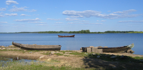 ![]() | I förgrunden ses karelska träbåtar med den typiska stävformen, som är gjord av en trädstam med rot. Den något bakåtsvängda stävspetsen är gjord av rotdelen. Aktern görs numera tvär för att passa en aktersnurra. I bakgrunden ligger shnjakan för ankar på Vodlasjön. |