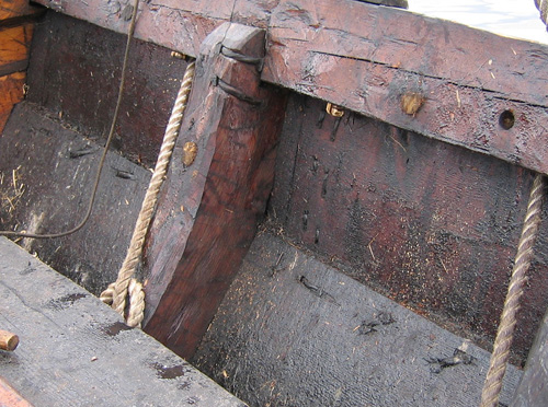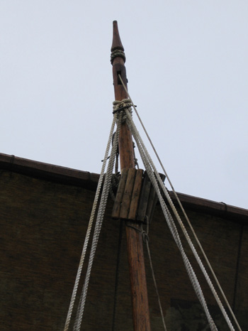![]() | Masttoppen. Fallet löper i ett block ovanför vantfästena. I stället för att använda ett lätt och litet krumvuxet trästycke består racken här av ett knippe sammanbundna runda träklabbar. |