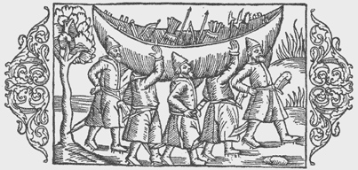 ![]() | Bishop Olaus Magnus describes in his book from 1555 AD comrehensively the life of the Nordic people. To the left you see a vignette from his publication that shows how the Russians curry their dug out boat from one stream to another. |