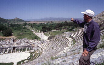 We arrive at 5 am to the small harbour of Assos. Pos N39 30' E26 20'. At the entrance we run aground on the 2500 year old ancient mole. A harmless contact with the pier to which Alexander the Great moored his ships. In Assos we have some problems with the military personel of the harbour but by a phonecall to Kemal, and with his kind help, the situation is taken care of. In the afternoon we walk to the ruins of Assos. Aristotle carried out much of his research on life sciences here. Beatiful scenery from the height of the Temple of Athena (picture to the right).