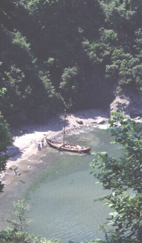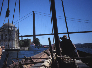 The photo to the left shows Heimløsa Rus passing through Bosphorus under one of bridges that connect Asia and Europe.We fought our way against the current and the wind through the Bosphorus. With a Viking ship this is possible only by knowing exactly how the currents and counter currents flow in the sound. The Bosphorus is nowadays one of the most frequently used water passages in the world. Going zigzag against wind and current, between big tankers coming in both directions and numerous ferries crossing the sound, is not easy - but we came through.