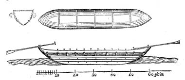 ![]() 1600-tals illustration av en flodbåt från Ukraina. Bottnen består av en urgröpt stock. På stocken har man satt några bord i klink. Notera styråror i båda ändarna och avsaknaden av köl. | Den franska admiralen Beauplan ger oss en 1600-tals illustration av en äsping från Ukraina (se bild till vänster). Enligt skissen skulle båten vara över 60 fot lång, vilket verkar överdrivet långt Jag undrar om en fransk 1600-talsfot är lika lång som en modern fot, dvs. 30 cm? Kanske någon läsare känner till detta och kan upplysa mig om saken. För övrigt är illustrationen och hans beskrivning mycket intressant. Vi ser en styråra i vardera ändan och sävknippen runt relingarna för att öka flytförmågan. Han beskriver att 50-70 kosacker byggde en dylik båt på 14 dagar. Man förstår nu bättre de historiska skildringar där det sägs att ruserna kom i flottor på 50 - 100 skepp längs floderna. Det var naturligtvis äspingar man kom i och inte havsgående skepp. På grund av sin konstruktion var äspingen kanske något av en slit och släng båt. En skada i stocken kan vara svår att reparera. Å andra sidan är stocken mycket stark i förhållande till sin tyngd vilket är bra eftersom man måste ha haft otaliga bottenkänningar under sina färder. |