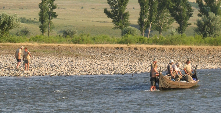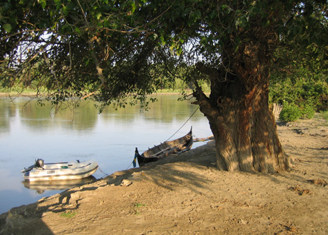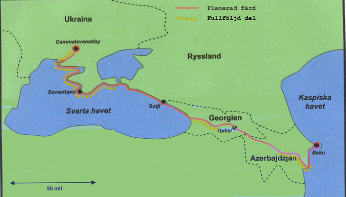 | De båtar som allmogen fortfarande använder på övre Kura är flatbottnade. En flatbottnad båt är också lättare att hantera vid landdrag. Man stöter ofta på påståendet att floderna var djupare under vikingatiden och sålunda medgav bättre framfart för havsgående båtar. Ett dylikt påstående borde grunda sig på fakta och inte på att någon gammal gubbe på stranden berättar att floden var djupare förr. Vid floden Kura, som jag fick erfarenhet av via mitt expeditionsdeltagande, finns det numera dammanläggningar som reglerar flodens övre lopp. Vad jag har förstått så reglerar de här dammarna variationerna i vattennivån men de kan knappast ha förorsakat en bestående sänkning av nivån i Kuras övre lopp. Däremot kan man tänka sig att dammarna har förorsakat en sänkning av vattennivån i flodens nedre lopp men det fanns inget som tydde på detta. Man såg mycket stora och gamla träd vid flodkanten vilket talar emot att flodens vattennivå skulle ha ändrats i någon större grad under de senaste århundradena. | ![]() |